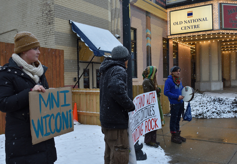 Last night I had the honor of meeting members of Nahko and Medicine for the People outside the Murat Old National Centre, where they were performing that evening. Each of them gave each of us a “fist bump” and huge smile. I was there with my #NoDAPL friends, showing our support, and trying to raise awareness, and enjoy the peace and snow and time together.