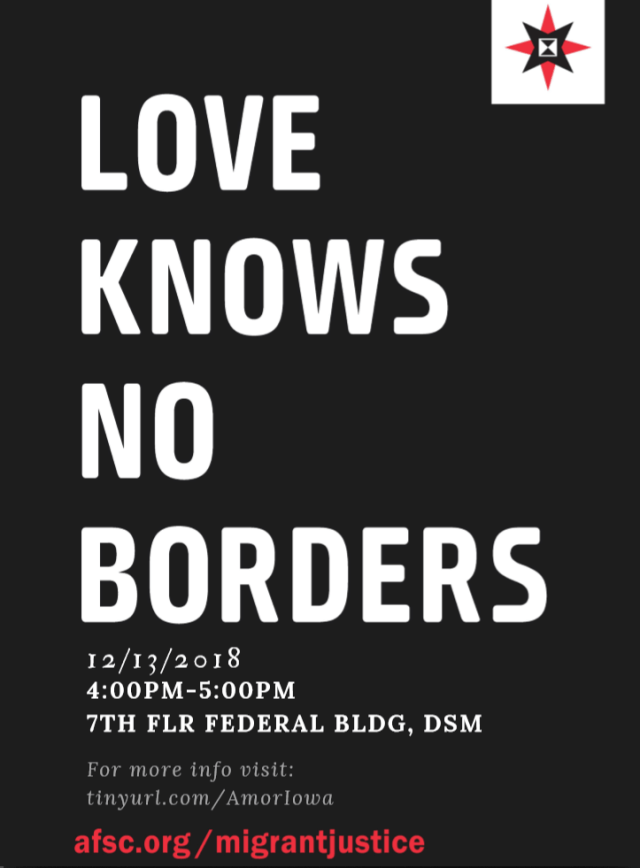 Today the American Friends Service Committee will be participating in this moral call for migrant justice by meeting at 4:00 pm at the Des Moines offices of our Senators, Chuck Grassley and Joni Ernst, 733 Federal Building, 210 Walnut Street.