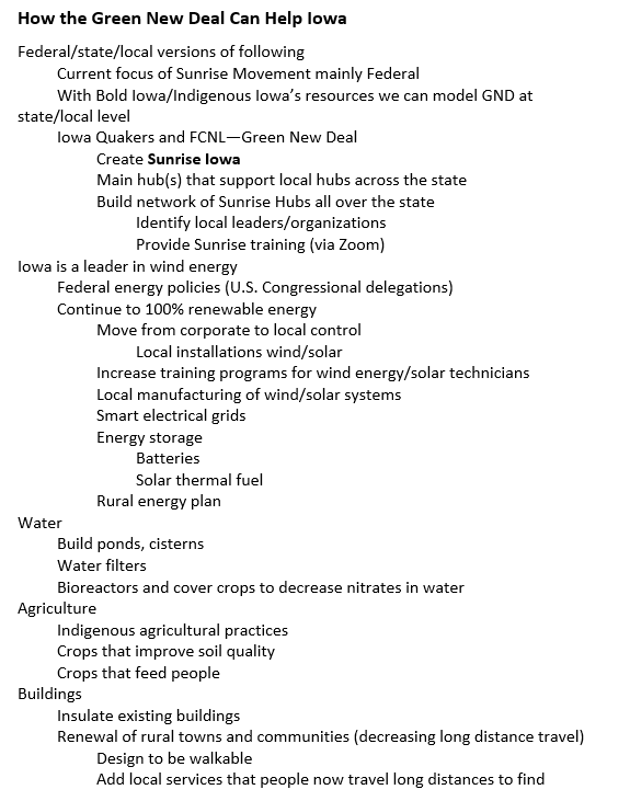 I was glad to be on a conference call this week, where Ed Fallon, Christine Nobiss, Kathy Byrnes, Shari Hrdina of Bold Iowa were able to talk with Sunrise Movement’s Will Lawrence about how we can support the Sunrise Movement and efforts to implement a Green New Deal. This was a kind of partners call, where we discussed other people and organizations in Iowa that we can work with, such as Iowa Citizens for Community Improvement (ICCI).