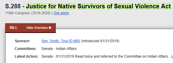 Senator Tina Smith (D-MN) introduce the Justice for Native Survivors of Sexual Violence Act (S.288) on 1/31/2019. You can find the text for S.288 here.