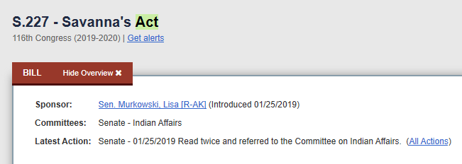 Senator Murkowski (R-AK) introduced Savanna’s Act (S.227) on 1/25/2019. You can find the text of S.227 here.