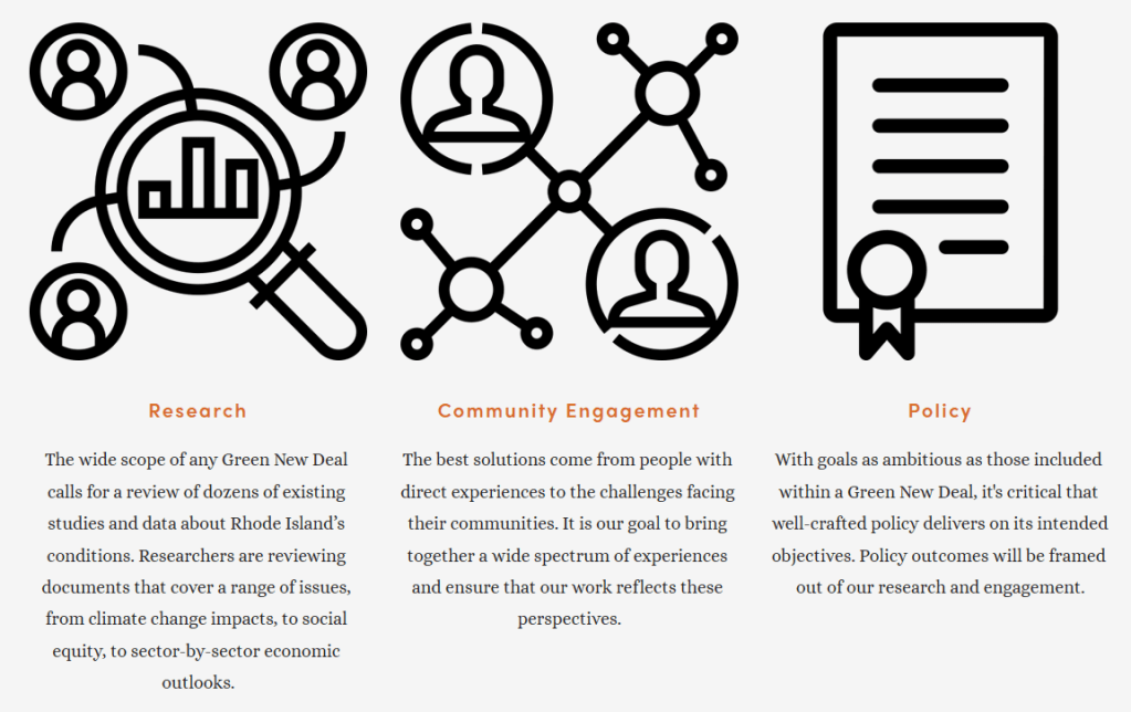 The Rhode Island legislation has the same objectives as the national plan but also calls for the Rhode Island Green New Deal Research Council to write recommendations regarding the benefits of a local Green New Deal and submitting it to the governor, General Assembly, and state agencies by May 15. Brown University is funding the research and other partners are being sought.