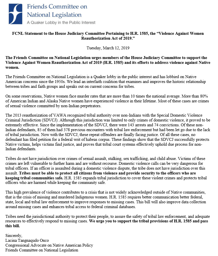 Violence Against Women Act Passes Out of House Judiciary Committee, Lacina Onco, FCNL, March 13, 2019