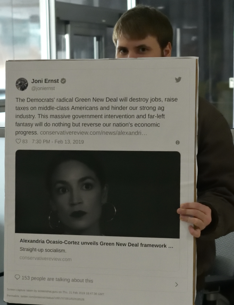 Our Sunrise Movement in Des Moines went to speak with Senator Ernst’s state director, Clarke Scanlon, who basically took notes. As we were waiting for our meeting to begin, he wondered why it was Senator Ernst who we were trying to get a message to. I told him it was because she is up for re-election in 2020.