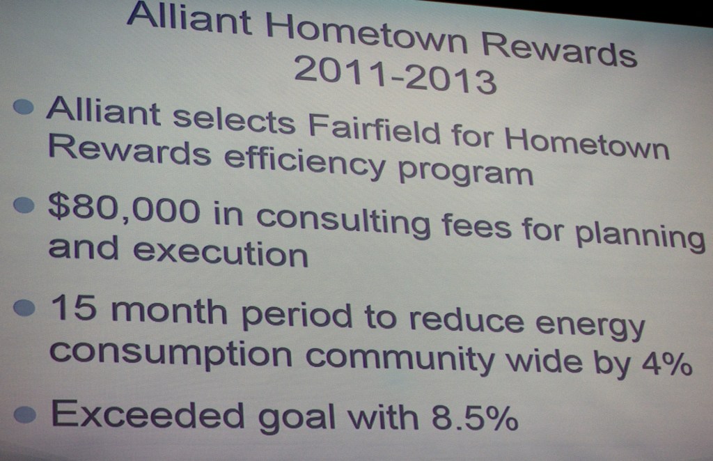 As seen above, Alliant Energy select Fairfield for its Hometown Rewards from 2011-2013. There is a storm water project and the development of wetlands and trails. A four day boot camp is offered for entrepreneurs for local food initiatives.
