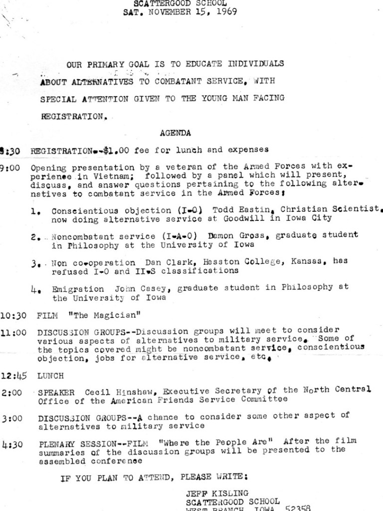 I was a Senior at Scattergood Friends School. Trying to figure out whether to be a conscientious objector, or to be a draft resister, occupied a lot of thought and time. I kept a journal at that time, and used that as a basis for a lot of blog posts I wrote about my struggles with the draft. https://kislingjeff.wordpress.com/?s=draft