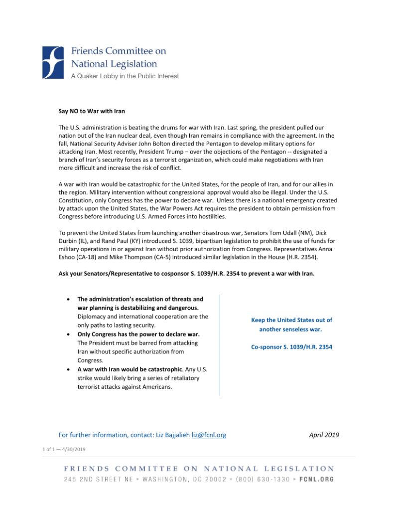 Stop the March to War with Iran, By Liz Bajjalieh, April 30, 2019, Friends Committee on National Legislation (FCNL)