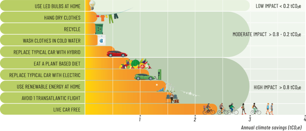 We recommend four widely applicable high-impact (i.e. low emissions) actions with the potential to contribute to systemic change and substantially reduce annual personal emissions: having one fewer child (an average for developed countries of 58.6 tonnes CO2-equivalent (tCO2e) emission reductions per year), living car-free (2.4 tCO2e saved per year), avoiding airplane travel (1.6 tCO2e saved per roundtrip transatlantic flight) and eating a plant-based diet (0.8 tCO2e saved per year). These actions have much greater potential to reduce emissions than commonly promoted strategies like comprehensive recycling.