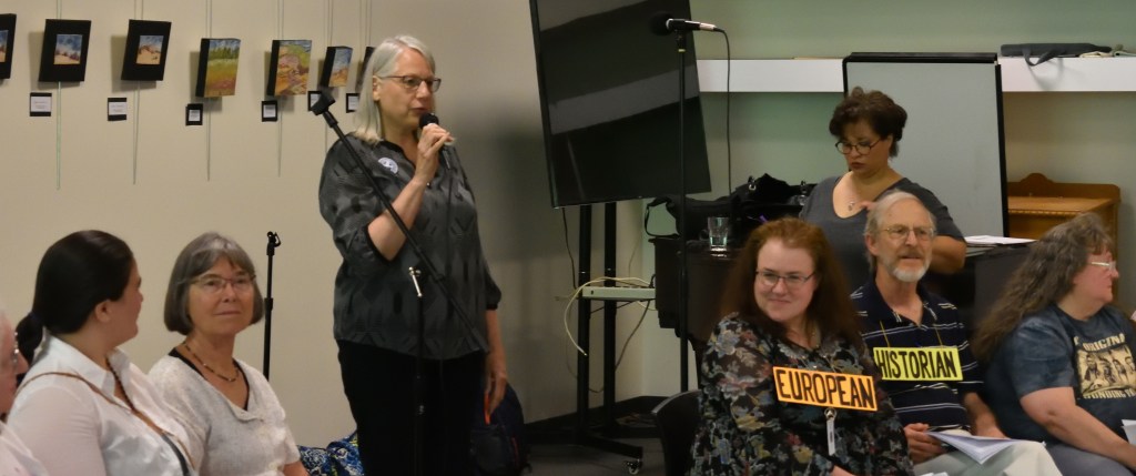 Paula led the workshop “Roots of Injustice, Seeds of Change” several times, including in Lincoln, Nebraska, West Branch, Iowa, and last night at the First Unitarian Church in Des Moines. This workshop uses a script Paula and Native educators developed to visually show how Native land and population was decimated during the westward expansion of white settlers. Several people filled the roles of facilitator, narrator, Native American, historian and European. Last night those roles were filled by: