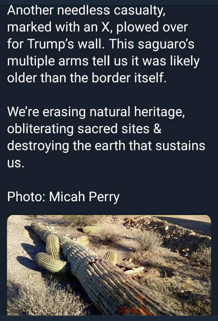 1) Tohono O’odham nation calls saguaros “aunt” and “uncle,” so that gives you an idea of what this represents aside from habitat destruction;