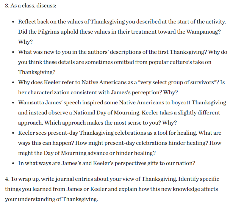 The following is a lesson called Thanksgiving Mourning found on the Teaching Tolerance website. The two documents used in this lesson are included to make it easier to print or otherwise share the lesson.