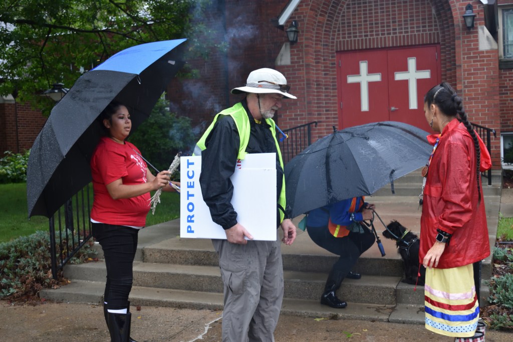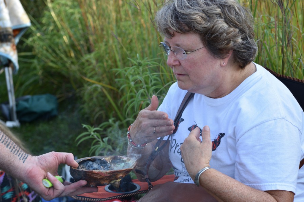 One of the things that helped bring us together during the First Nation-Farmer Climate Unity March was sharing the burning of sage with everyone on the March. These photos also show the burning of sage (smudging) during the ceremony of planting two trees at Bear Creek Friends Meeting to honor the memory of Roy and Wanda Knight. There are also a couple of photos of smudging taken at the Prairie Awakening/Prairie Awoke celebration at the Kuehn Conservation Area near Bear Creek Friends Meeting. The Meeting has been involved with Prairie Awakening for many years.