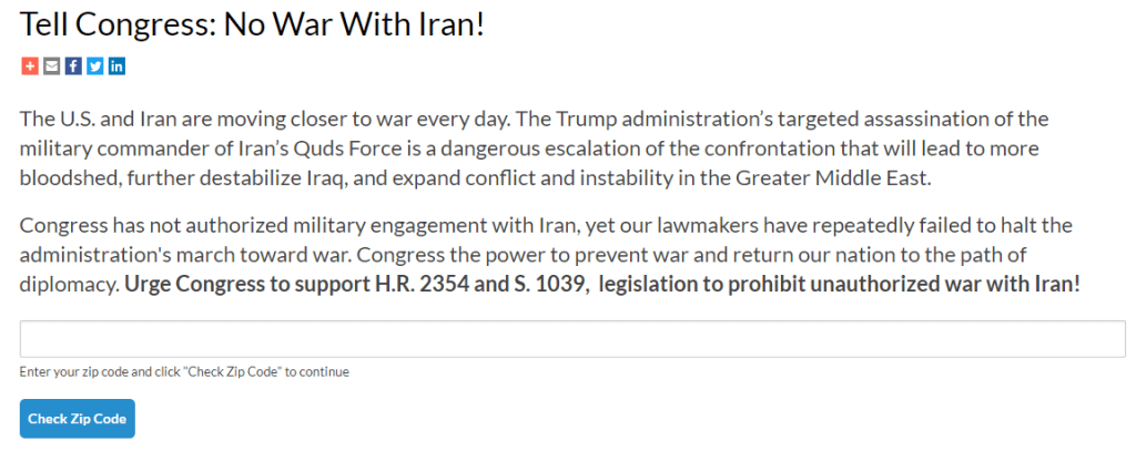 Here is the link to the following page you can use to send a message for no war with Iran to you Congressional Representatives. Tell Congress: No War with Iran! ›