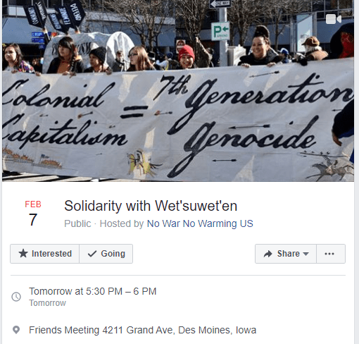 Here in Iowa we will hold a vigil in solidarity with the Wet’suwet’en people at 5:30 pm tonight (Feb 7) at 4211 Grand Avenue in Des Moines.