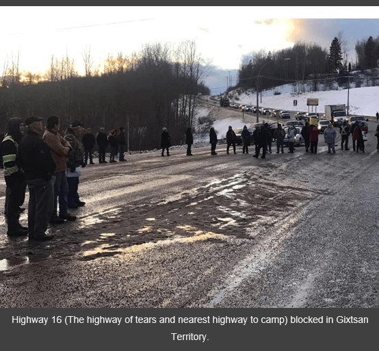 | As of 4:44 PM Chiefs & supporters blocked the road at 27km, forcing RCMP to let Wet’suwet’en chiefs in. Clearing work has stopped at 44km. Dsta’hyl (Likht’samisyu) said the #Wetsuweten will enforce the eviction of Coastal Gaslink, with any means at their disposal. Military tactical RCMP are amassed just before the camp at 44 and we’re seen waiting around the corner and hiding in the bush before nightfall RCMP Threaten to Arrest Journalist for Doing his Job During Police Raid in Northern BC Canadian Association of Journalists Condemns Crackdown on Reporters in Wet’suwet’en Territory All entrances to the Port of Vancouver were shut down today! Indigenous Youth are still locked down at the BC capital! UVIC Students walked out of class to join them! Rail Lines were shut down in Mohawk Territory and Highway 408 was blocked in 6 Nations, and Highway 16 blocked in Gitxsan Territory! Action Across Turtle Island are planned for tomorrow and through the weekend! |