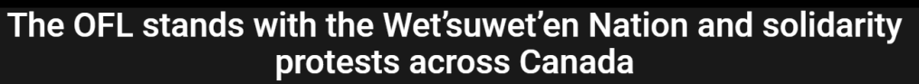 (TORONTO, ON) – The Ontario Federation of Labour (OFL) affirms its solidarity with the Wet’suwet’en Nation, as they steadfastly defend their territories, and with those who are actively supporting Indigenous sovereignty through protests and blockades across Ontario and Canada.
