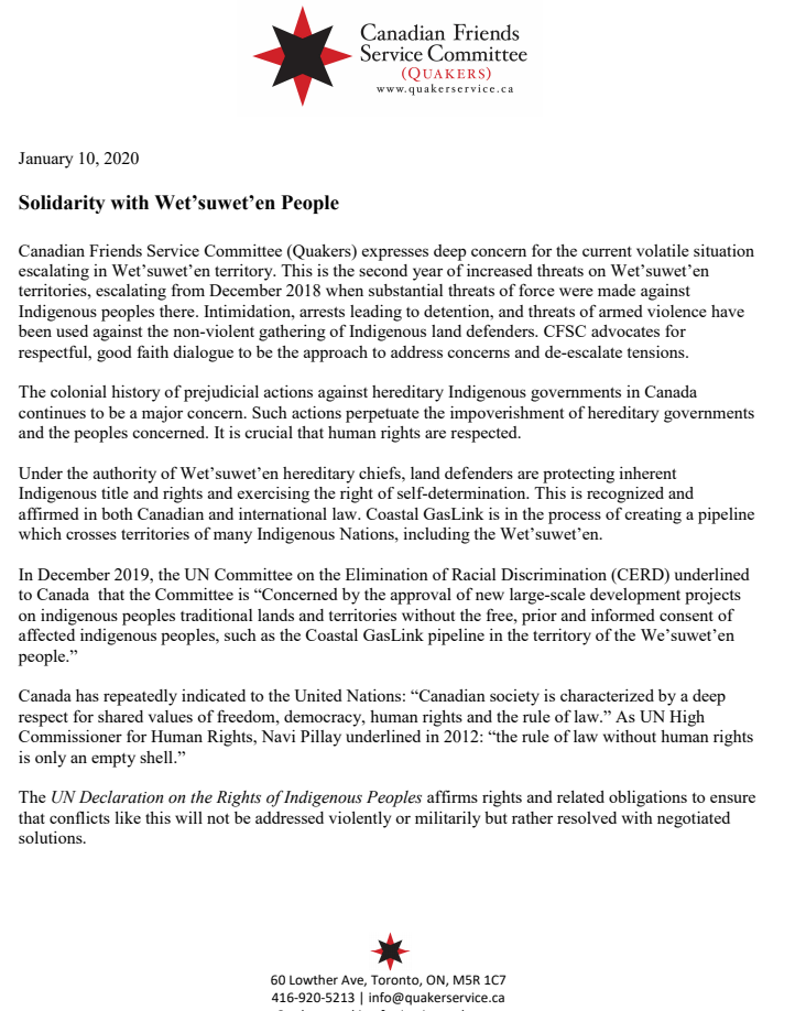 Canadian Friends Service Committee. CFSC stands with all Wt’suwet’en people, January 18,2019