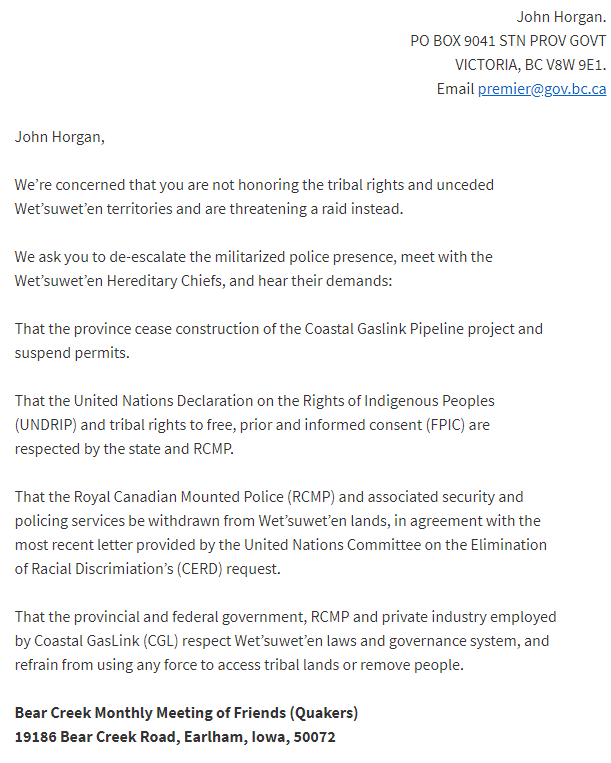 Bear Creek Friends of Iowa Yearly Meeting (Conservative) letter to John Horgan, Premier of British Columbia.