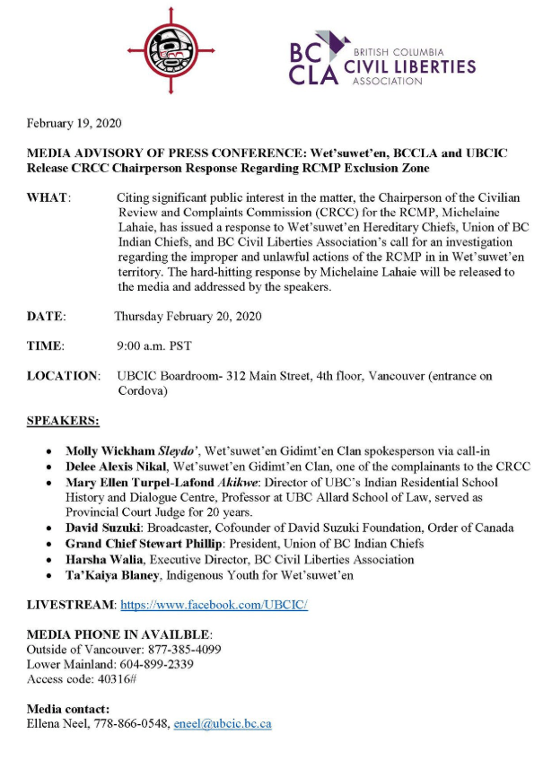 Union of British Columbia Indian Chiefs, UBCIC https://www.ubcic.bc.ca and the British Columbia Civil Liberties Association will hold a press conference tomorrow, Feb 20, 2020. Details below: