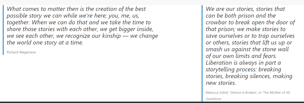 One of the reasons I’ve continued to write about the March since then is because the intention of the March was to create a community of native and nonnative people who got to know each other by sharing the physically demanding 94 mile walk from Des Moines to Fort Dodge, Iowa, along the path of the Dakota Access pipeline. Who had the unique opportunity of sharing our stories with each other, allowing us to get to know each other and begin to trust each other. It is because I am a firm believer in the importance of sharing our stories with each other, that I put the following quotations on the home page.