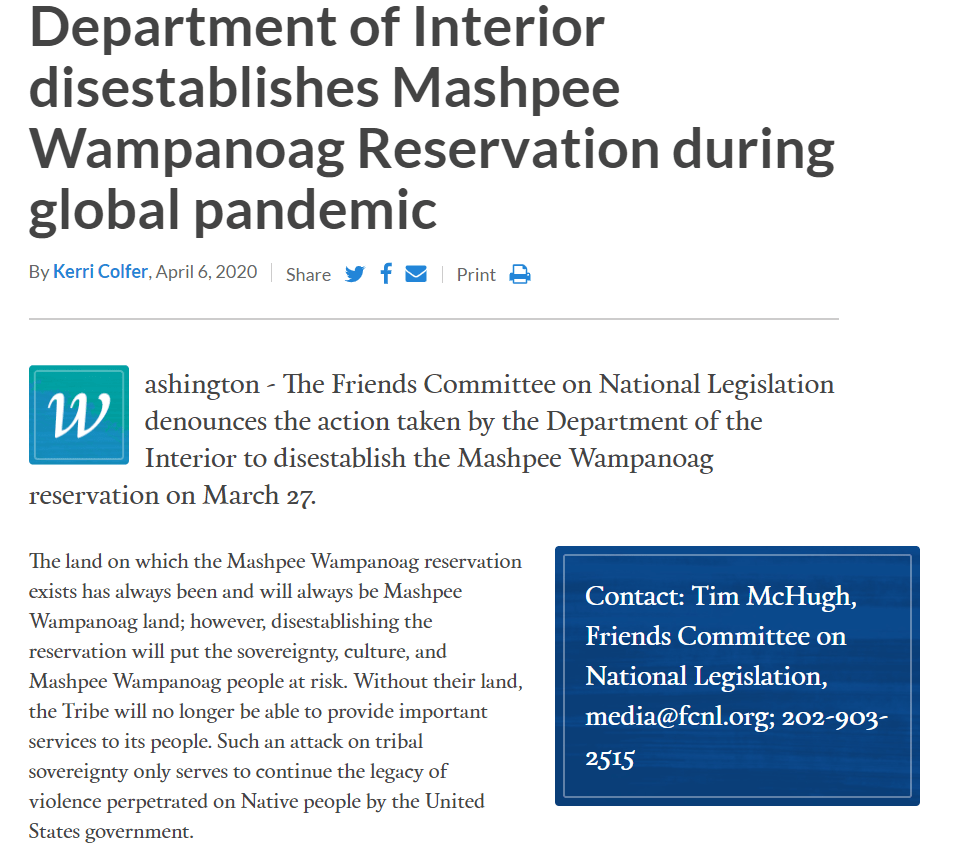 Washington – The Friends Committee on National Legislation denounces the action taken by the Department of the Interior to disestablish the Mashpee Wampanoag reservation on March 27.