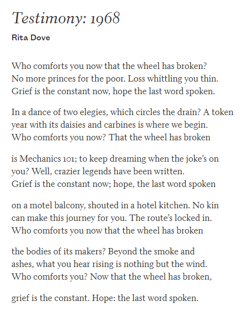 “Two years ago, the composer Richard Danielpour and I were commissioned by Copland House in New York to begin work on a song cycle that would span the past half-century of American history: a baker’s dozen worth of testimonials, lyric vignettes arranged for a single soaring mezzo-soprano. ‘Testimony: 1968’ sets the trajectory in motion by chronicling the turbulences of 1968: the Vietnam War, the ongoing struggle for civil rights, and of course, the assassinations. I chose the villanelle form, with its relentless double-refrain, to evoke the turmoil of that year—the spiraling outrage and eddying despair—but also the swirls of hope that have risen and fallen through the years since. The entire song cycle, called A Standing Witness, was scheduled to premiere this summer at the Tanglewood Music Festival in Massachusetts but, because of the pandemic, might have to be moved to a later date.” — Rita Dove |
