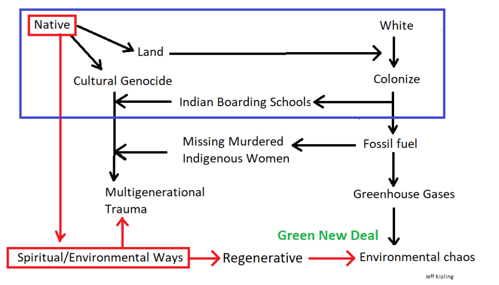 As I also wrote in the blog post referenced above, after years of trying and failing to use critical thinking to get people to stop fossil fuel abuse, I looked for cultures that were living sustainably. Which led me to learn more about Indigenous peoples. (see https://kislingjeff.wordpress.com/?s=native+indigenous). I’ve been learning more about spirituality and all our relations (in the Native sense). Learning more about our sacred connection to Mother Earth.