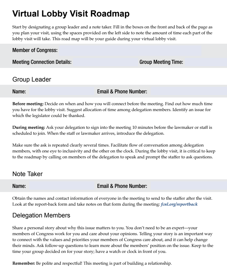 - Plan for your virtual lobby visit: Meet virtually with your lobbying group to plan your conversation using FCNL’s virtual lobbying road map. Don’t forget to assign roles, write down the logistical details, and time a practice session.