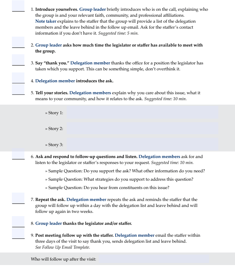 - “Arrive” Early: If you are using your own phone or video line, gather your delegation at least 10 minutes before the call is set to begin. Take attendance and make sure the note taker has the names, cities, states, and email addresses of all participants to include in the follow-up email.