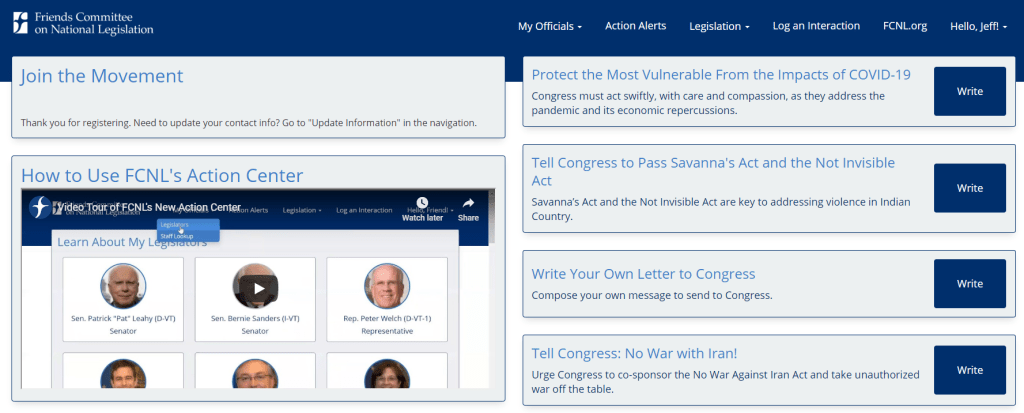 The first tool the FCNL staff taught us about was how to lobby Congress from home. Organize your own virtual lobby visit .Congress needs to hear your voice, especially during this unprecedented national quarantine. Now is the time to lobby “virtually” via your home phone or computer! This link includes a number of excellent resources to use to set up your virtual lobby visits.