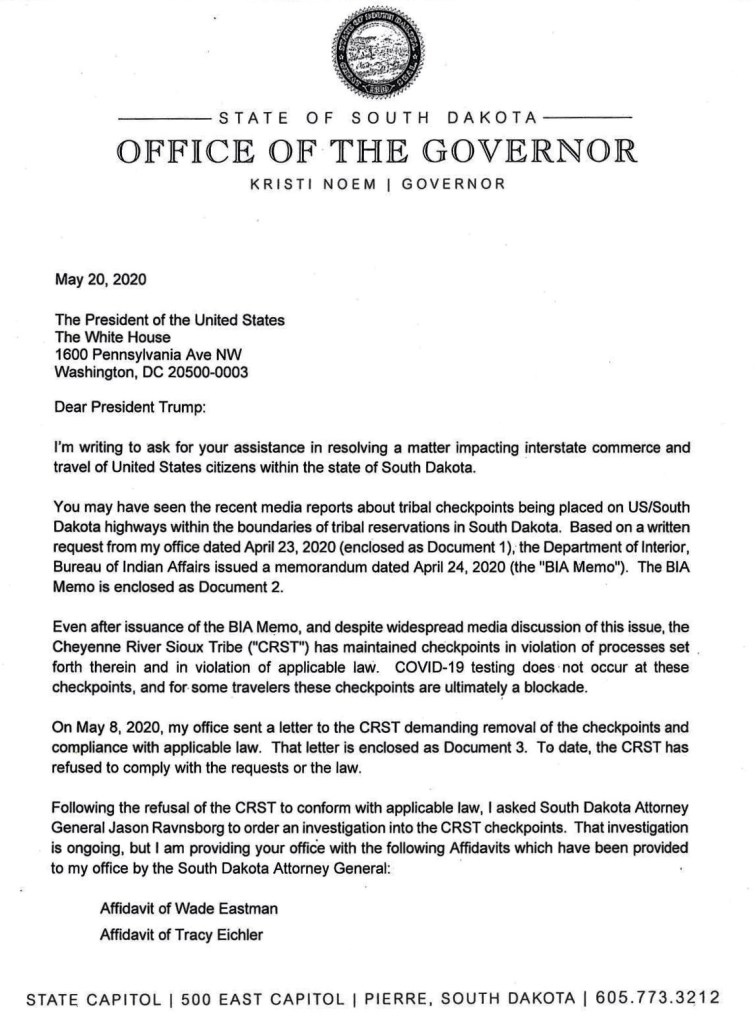 Yesterday the governor of South Dakota sent the letter below about the checkpoints to the White House. Who knows what will happen now?