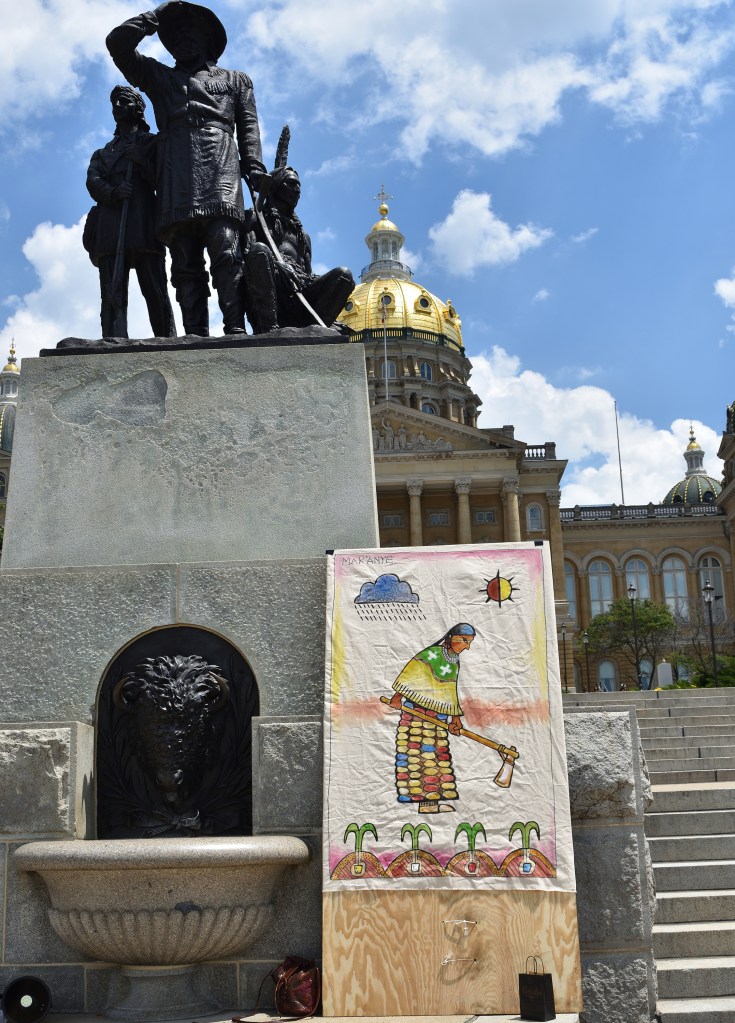 1:38 p.m.: Indigenous organizers address the crowd of nearly 250 people gathered outside the Capitol. Donielle Wanatee, a Meskwaki organizer with Seeding Sovereignty and Indigenous Iowa, said she had expected resistance to the idea of removing statues.