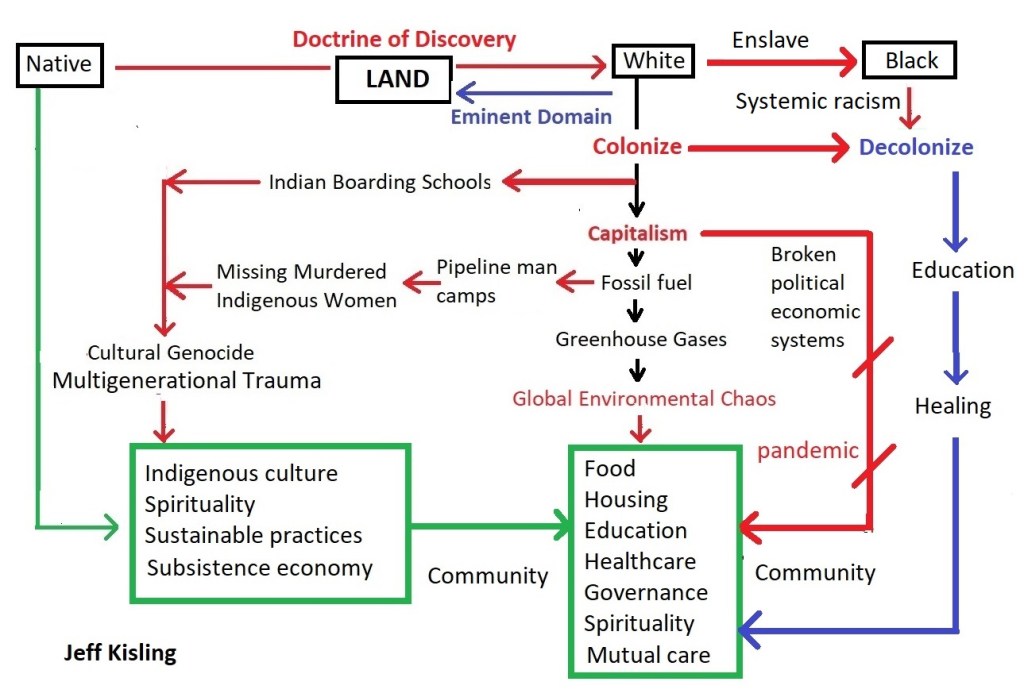This is the diagram I keep updating as I think and learn more about the interconnections between White settler colonists and Black and Native peoples. Our broken political and economic systems, based on capitalism, are failing dramatically now. The pandemic worsens our situation. We need Indigenous culture, spirituality, sustainable practices and a subsistence economy to build better communities.