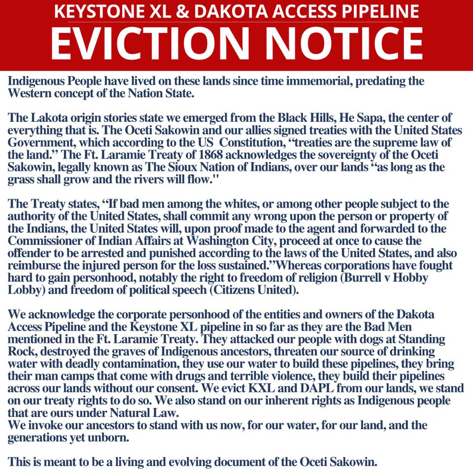 We evict KXL and DAPL from our lands, we stand on our treaty rights to do so. We also stand on our inherent rights as Indigenous people that are ours under Natural Law.