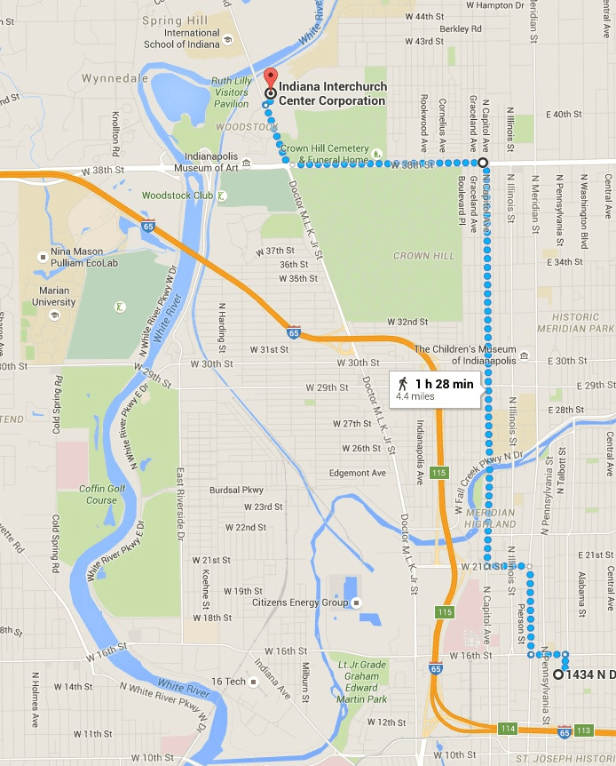 Although I had planned to ride my bicycle, the tire went flat within a few blocks of my apartment, so I took a city bus to 38th and Meridian (where the route turns left on the map below). From there it was only 1.7 miles to Interchurch Center. But within a couple of blocks of leaving the bus, it began to rain. And then it began to really come down. Thunder and lightning. And then the wind began to blow so hard I had to lean way forward just to walk. And the street began to fill with water, which passing cars threw up in the air, and onto me.