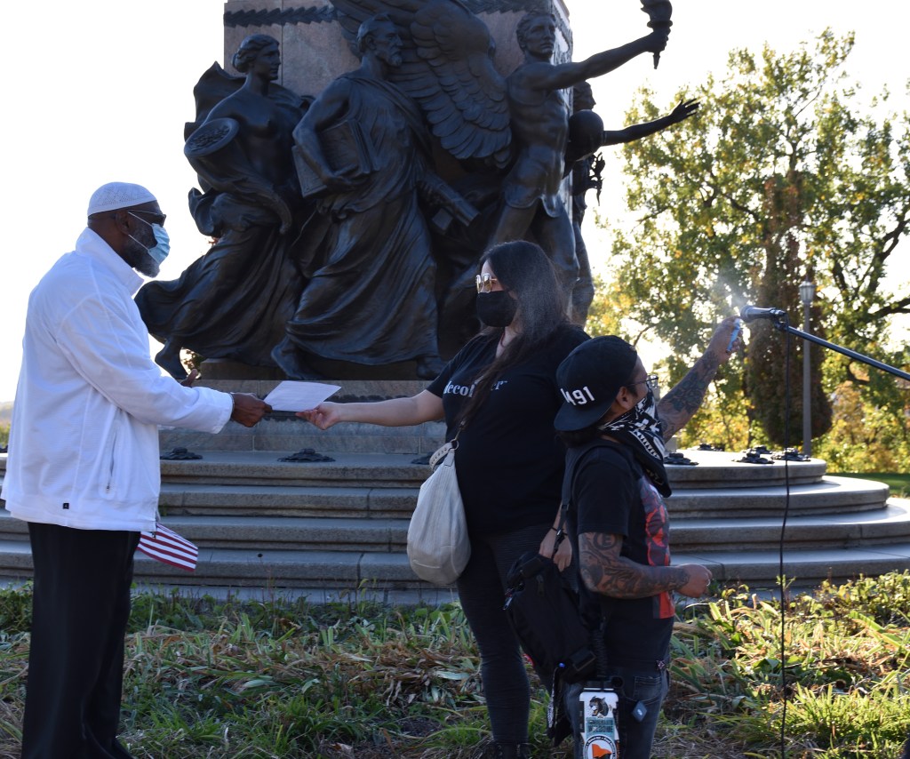 Organizers presented Iowa State Rep. Ako Abdul-Samad a petition calling for the removal of the bust of Columbus, Pioneer and friendly Indian Statue and “mural of manifest destiny” on Iowa State Capitol grounds.