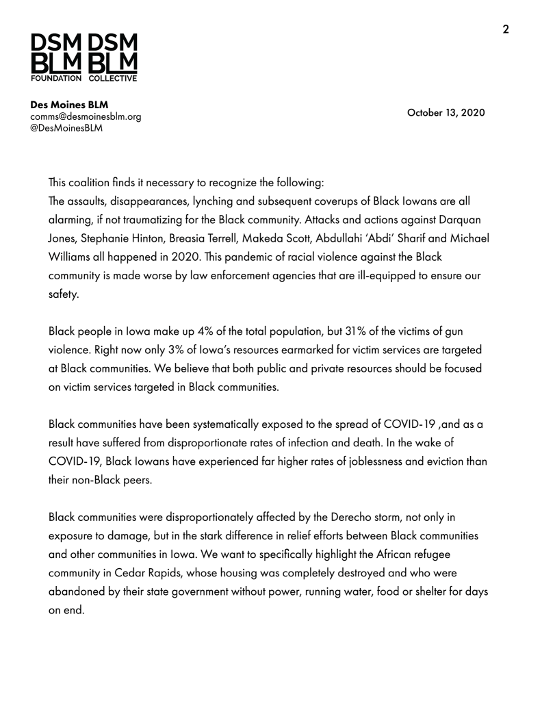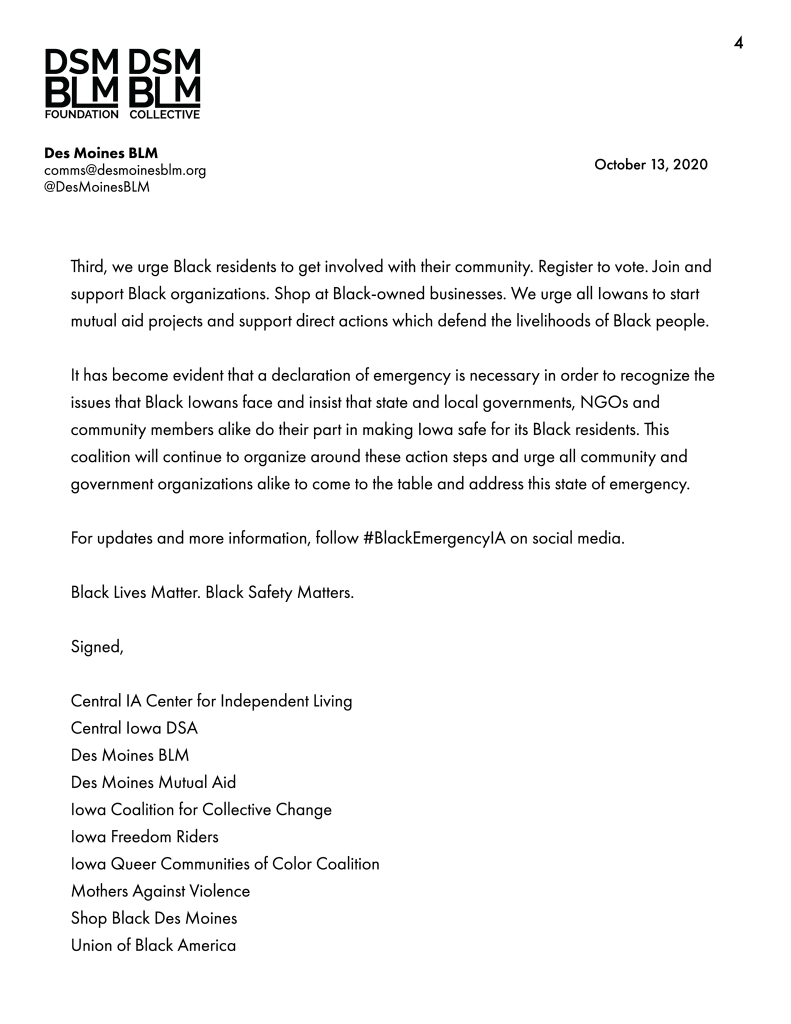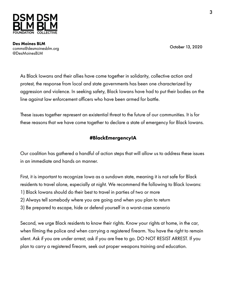 Des Moines Black Lives Matter October 13 at 11:20 AM · Black Iowans are not safe. We’re joining with a number of other community organizations to implement strategies and policies to protect one another. #BlackEmergencyIA The Press Release can be found at the end of this post.