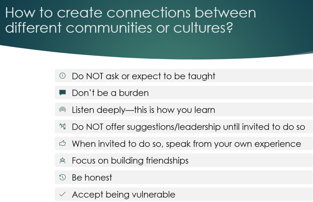 Listening to, and following the lead of that community does several things. First, it shows your respect for the community. It builds trust when you honor what is being said and done. It teaches you so many things you didn’t know about the difficulties the community is dealing with. Teaches you what the community already knows about how to address those issues. It creates the space that is essential if you are ever going to be invited to work together.