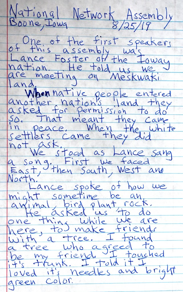 I just returned from an amazing event, the National Network Assembly, held at the Des Moines YMCA Camp near Boone, Iowa. From information about the Assembly we received ahead of time, I knew I wouldn’t have WiFi or cell phone access, so I didn’t even bring my laptop. As I mentioned in yesterday’s post though, there were so many things I wanted to write about and I was missing my (nearly) daily writing, so I wrote two blog posts by hand.