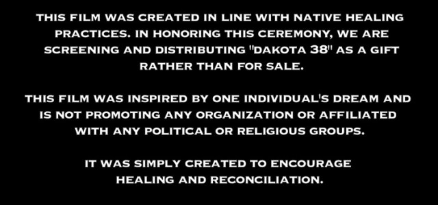 This film was created in line with Native healing practices. In honoring this ceremony, we are screening and distributing “Dakota 38″ as a gift rather than for sale. This film was inspired by one individual’s dream and is not promoting any organization or affiliated with any political or religious groups. It was simply created to encourage healing and reconciliation.