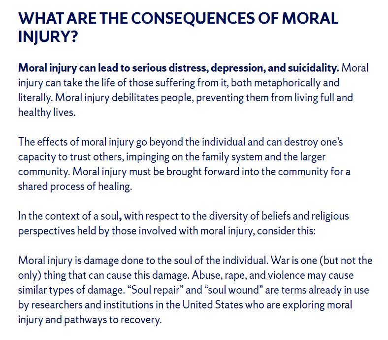 I’ve just learned of the concepts of moral injury and soul repair. The vast majority of the literature is related to soldiers and war. Unsurprising as there is a profound disconnect between religion’s commandment not to kill, and soldiers experiencing forceful training to condition them to be able to kill in conflict. And deeper injury when a soldier does kill, or observes others killing. It is sobering to realize the vast number of men and women who have been morally injured this way. Why so many soldiers cannot function when they return from conflict. Why so many commit suicide.