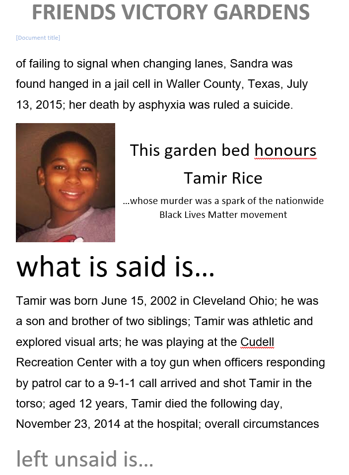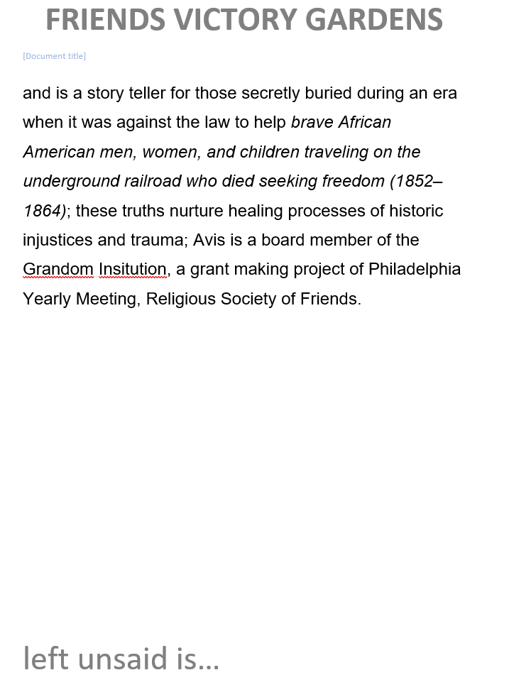 In this QuakerSpeak video Avis Wanda tells the story of her Friends Victory Garden. Following that she tells who each garden box honours. For each she tells what is said… and what is left unsaid… At the end is a photo of the greenhouse that Avis Wanda says is dedicated to the Africans who died on the slave ships carrying them to the Americas on the middle passage. To honour those whose names are unknown.