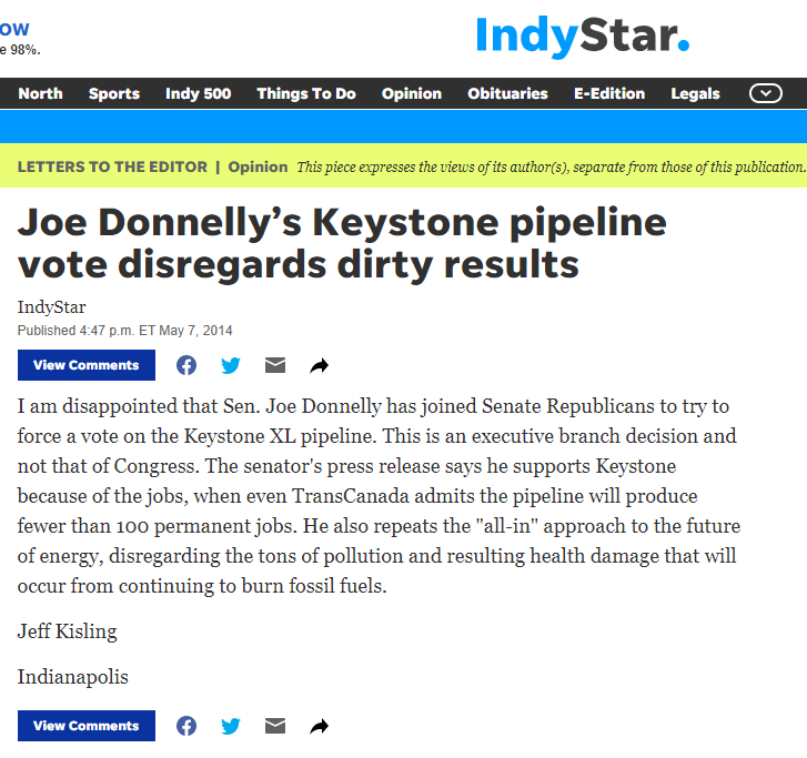 We held multiple public rallies in downtown Indianapolis. When Indiana’s US Senator, Joe Donnelly said Keystone would create many jobs, the Indianapolis Star printed my letter to the editor. He didn’t say anything about jobs after that.