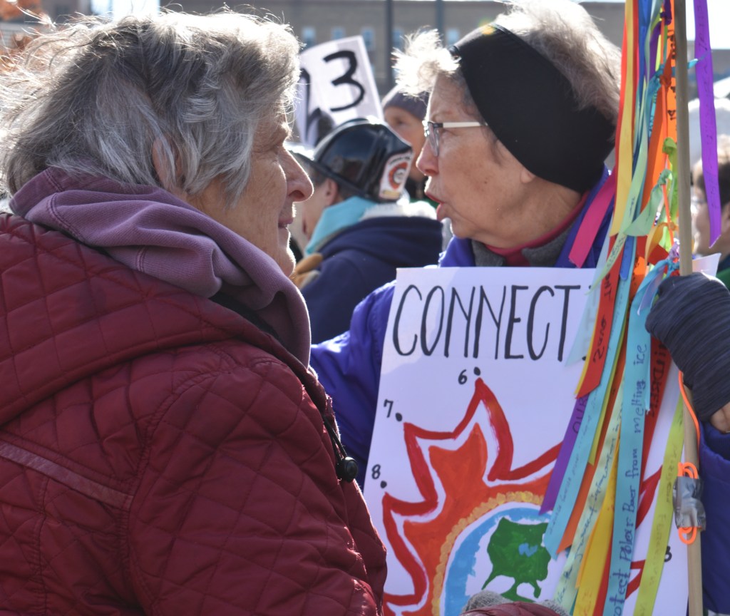 The Stop the Money Pipeline mentioned above posted this interesting coordinated action. Bill McKibben and others stage a sit-in at a branch of the CHASE bank in the Bay Area. He is connected by phone to Jane Fonda who leads a rally close to the CHASE bank McKibben’s group is sitting-in. Jane Fonda’s group then goes to the bank in support of those inside.