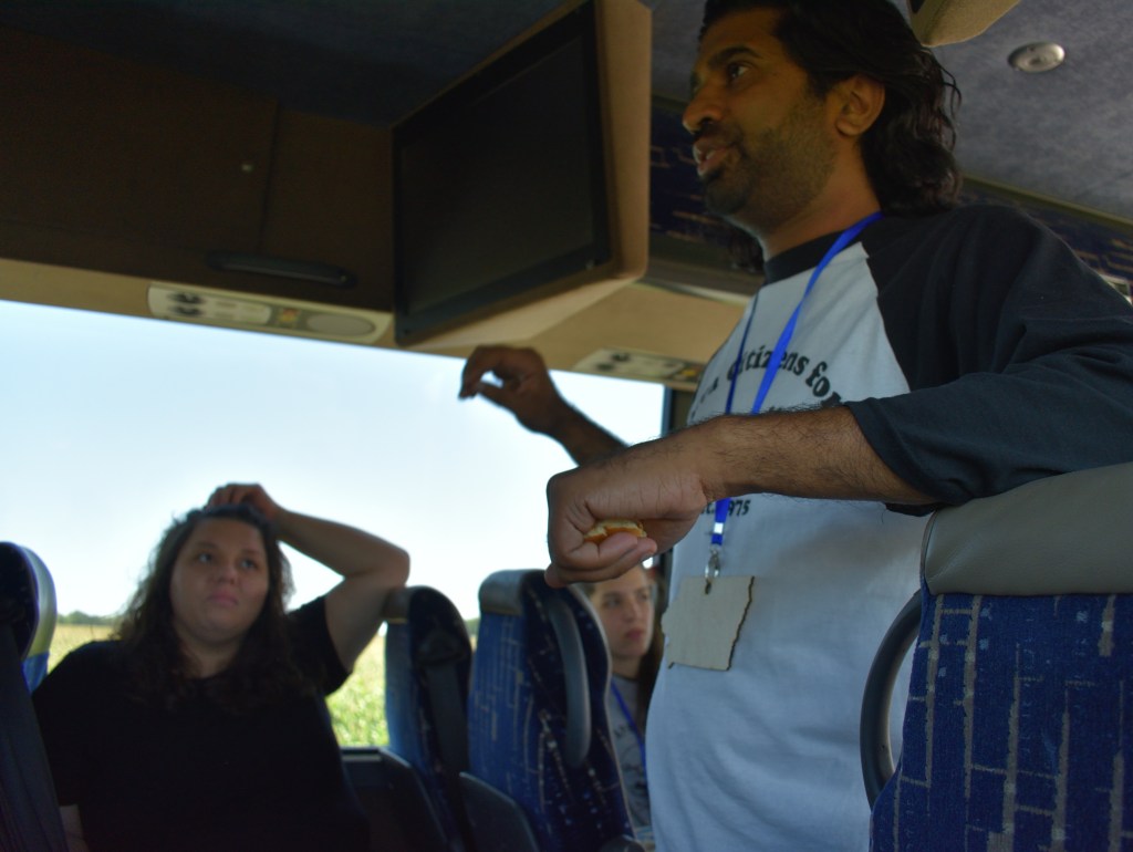 ICCI had arranged for sack lunches and bus transportation from the Y Camp to Des Moines. It was disappointing that only a dozen of us decided to go to the action. We set out for Des Moines, but ran into (not literally) a railroad crossing that was blocked by a train that wasn’t moving. Shawn and Ross were in contact with the ICCI staff in Des Moines. Unfortunately the train was still there after 30 minutes. At that point we couldn’t get to Des Moines in time, so we returned to the Y Camp. We did use the time to talk more about direct action and share some of our stories.