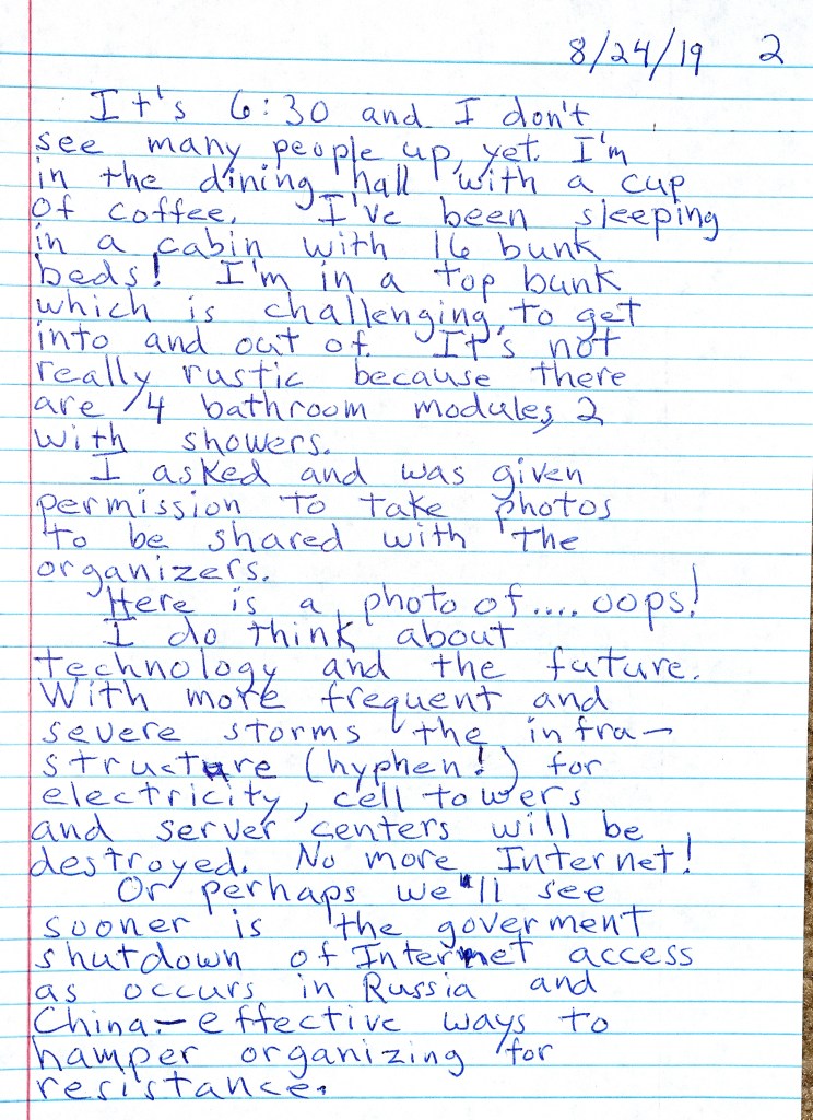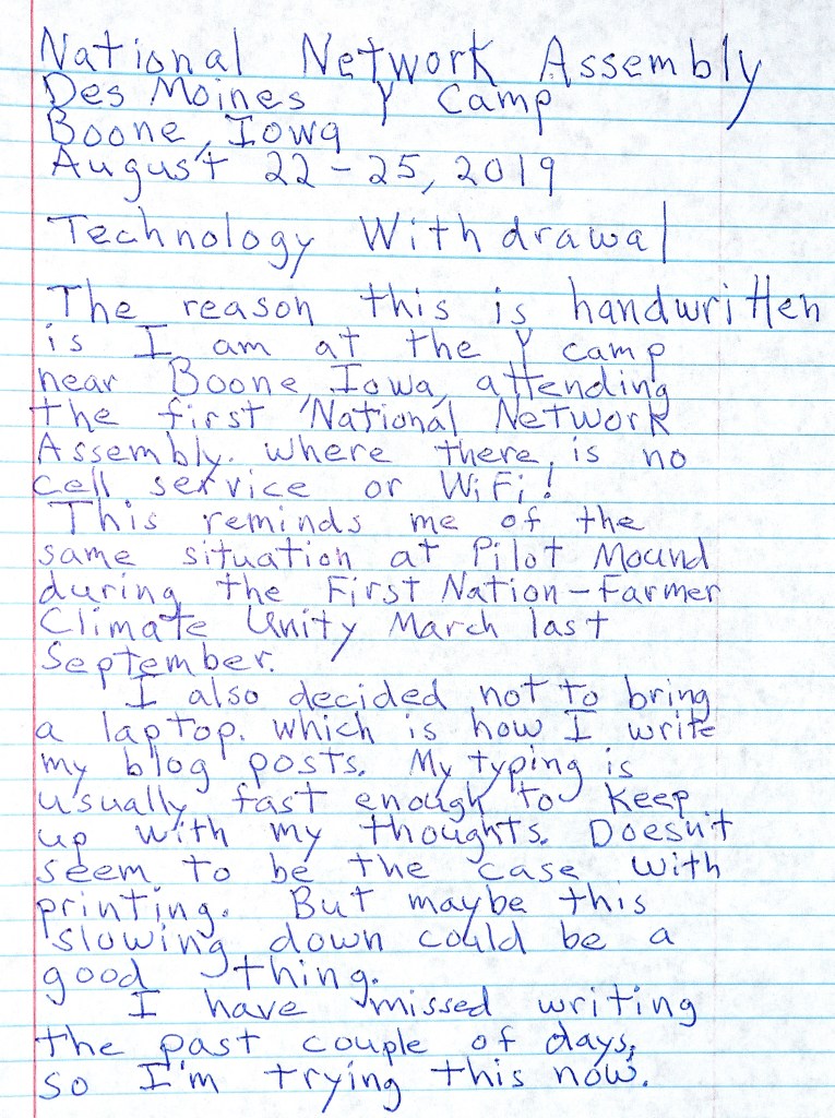 I just returned from an amazing event, the National Network Assembly, held at the Des Moines YMCA Camp near Boone, Iowa. From information about the Assembly we received ahead of time, I knew I wouldn’t have WiFi or cell phone access, so I didn’t even bring my laptop. As I mentioned in yesterday’s post though, there were so many things I wanted to write about and I was missing my (nearly) daily writing, so I wrote two blog posts by hand.