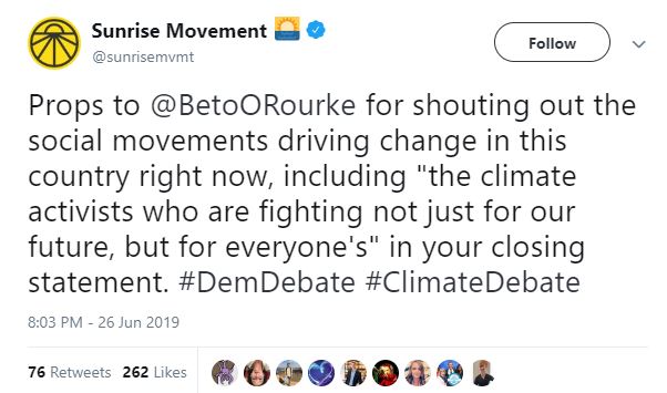 Last night was the first debate with Democratic presidential candidates. Those who understand the rapidly growing, interrelated list of severe consequences of climate chaos had hoped the candidates would speak much more forcefully and fully about climate change were disappointed. Only Governor Jay Inslee used his time on stage to focus on climate chaos. Beto O’Rourke did mention groups such as the Sunrise Movement “who are fighting not just for our future, but for everyone’s.”